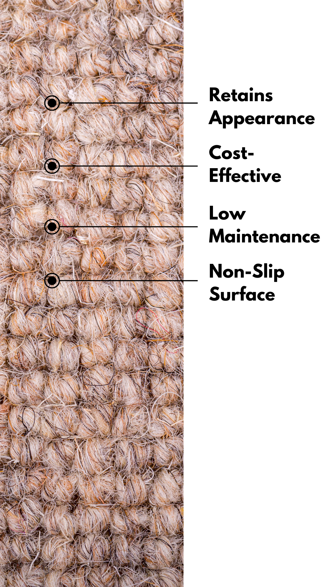 The looped fibers provide excellent resilience and maintain their shape under pressure, making the carpet resistant to wear, flattening, and matting even in high-traffic areas. - Superior Stain and Spill Resistance